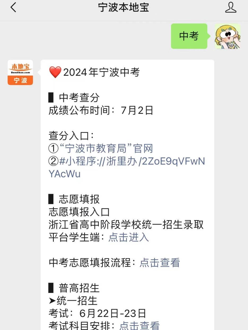 温馨提示:微信搜索关注公众号【宁波本地宝】,回复【中考】可获取2024年宁波中考中招录取日程安排、成绩查询时间 查询入口、志愿填报入口、志愿填报流程图解等信息!