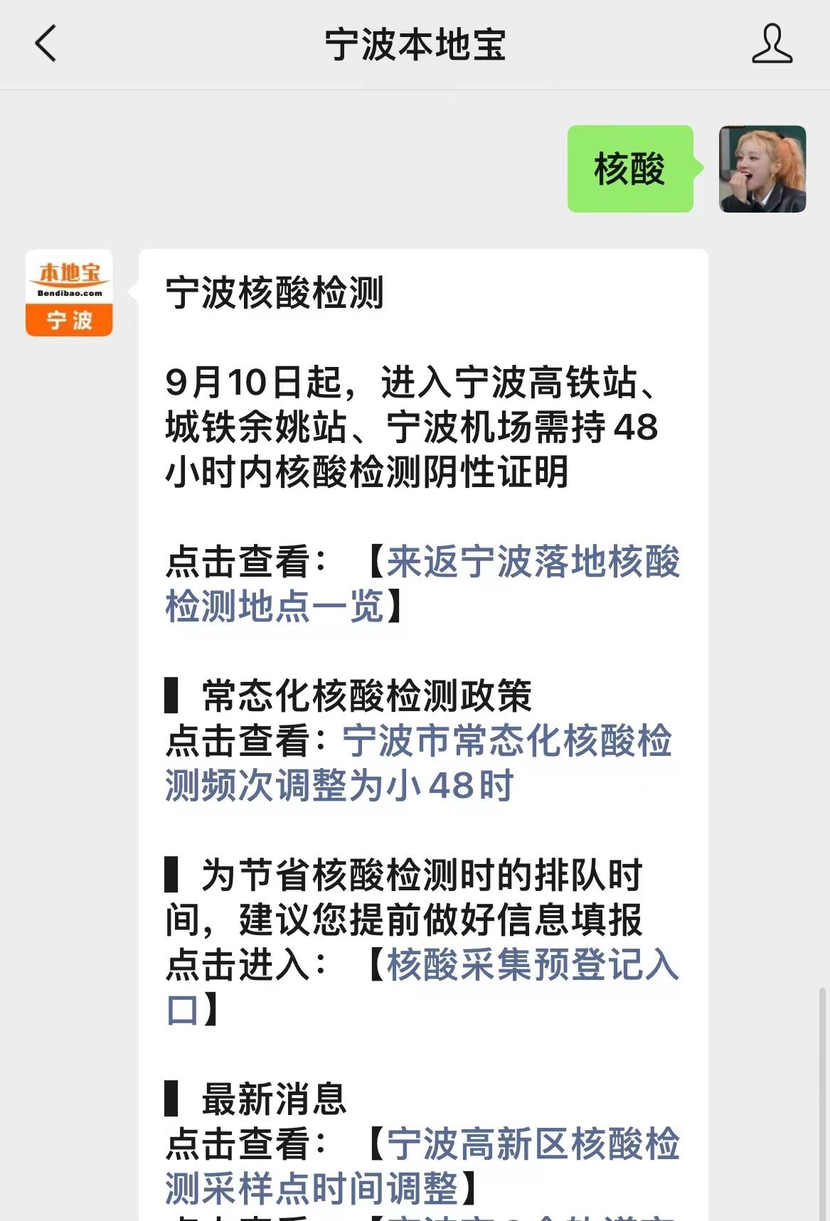 温馨提醒:微信搜索关注【宁波本地宝】, 在对话框回复【核酸】可获取宁波核酸最新通知和政策规定、核酸采样时间 地点 对象、核酸检测结果查询等信息!
