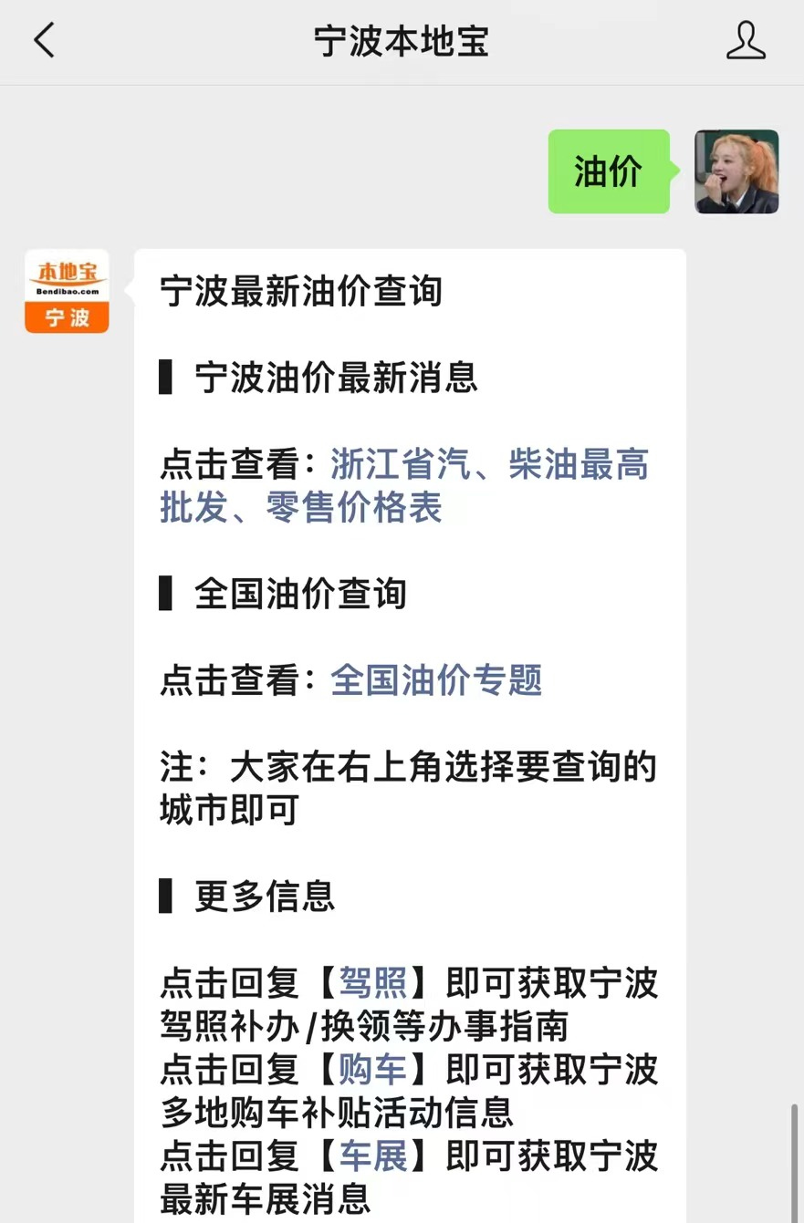 温馨提醒:微信搜索关注【宁波本地宝】, 在对话框回复【油价】可获取2023年浙江省宁波最新油价查询、浙江省汽/油最高零售价格表、全国油价查询等!